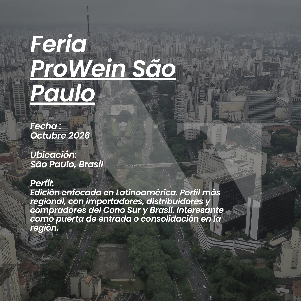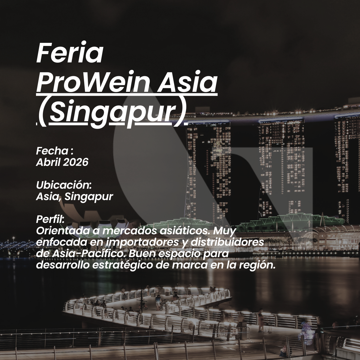 ProWein Asia ( Singapur): Feria de vino orientada a los mercados asiáticos, con fuerte foco en importadores y distribuidores de Asia-Pacífico. Espacio clave para el desarrollo estratégico de marca, apertura de nuevos mercados y posicionamiento regional.