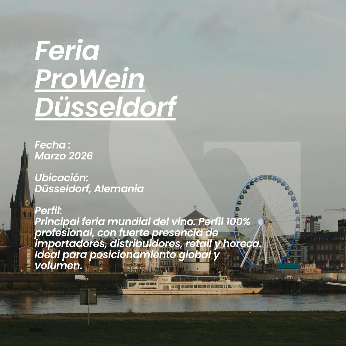 ProWein Düsseldorf: Principal feria mundial del vino, de alcance internacional y perfil 100 % profesional. Reúne importadores, distribuidores, retail y horeca, siendo un evento clave para el posicionamiento global de marca, generación de negocios y operaciones de volumen en el mercado vitivinícola.