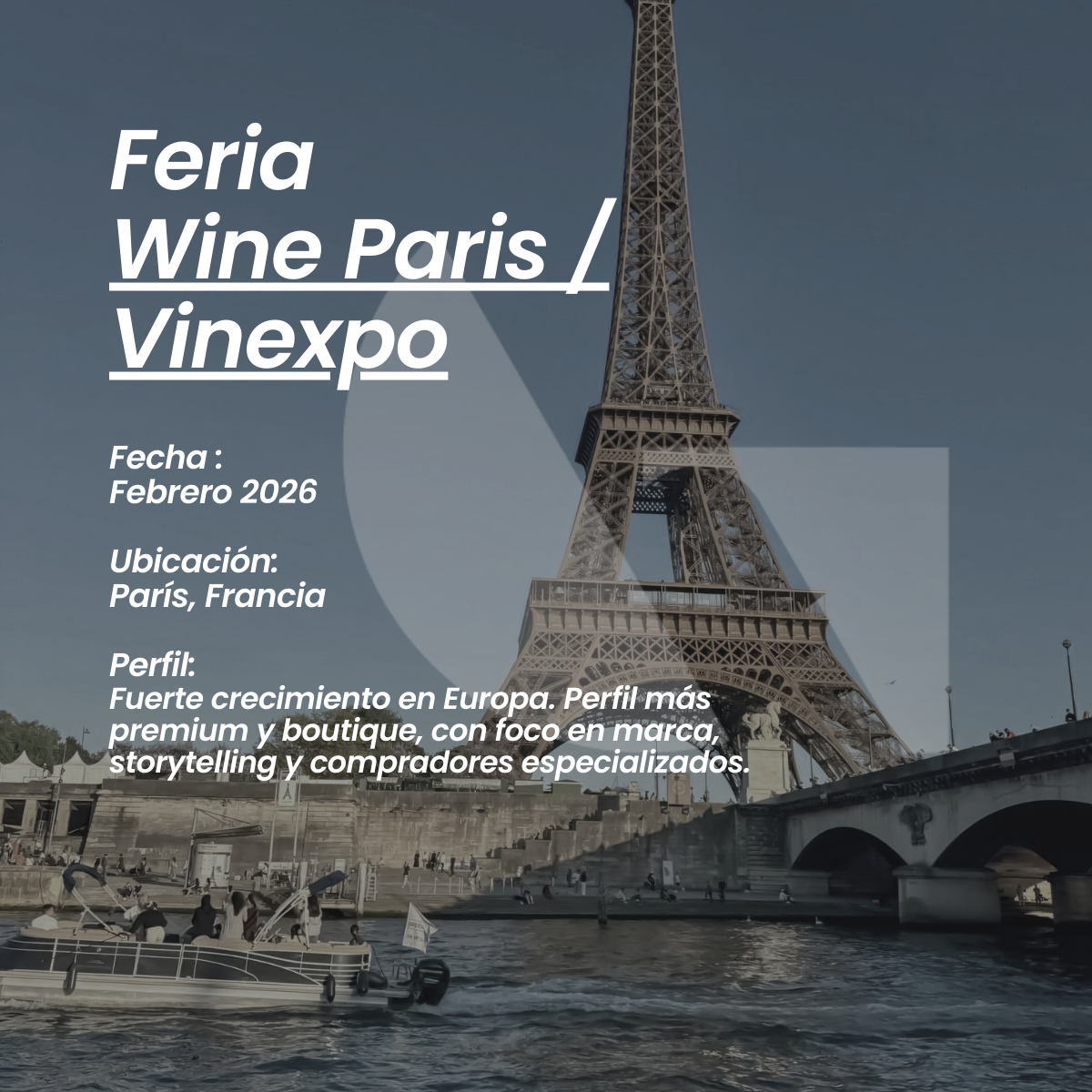 Wine Paris / Vinexpo: Feria de vino en fuerte crecimiento en Europa, con un perfil premium y boutique. Enfocada en posicionamiento de marca, storytelling, vinos de autor y vínculos con compradores especializados del mercado europeo.