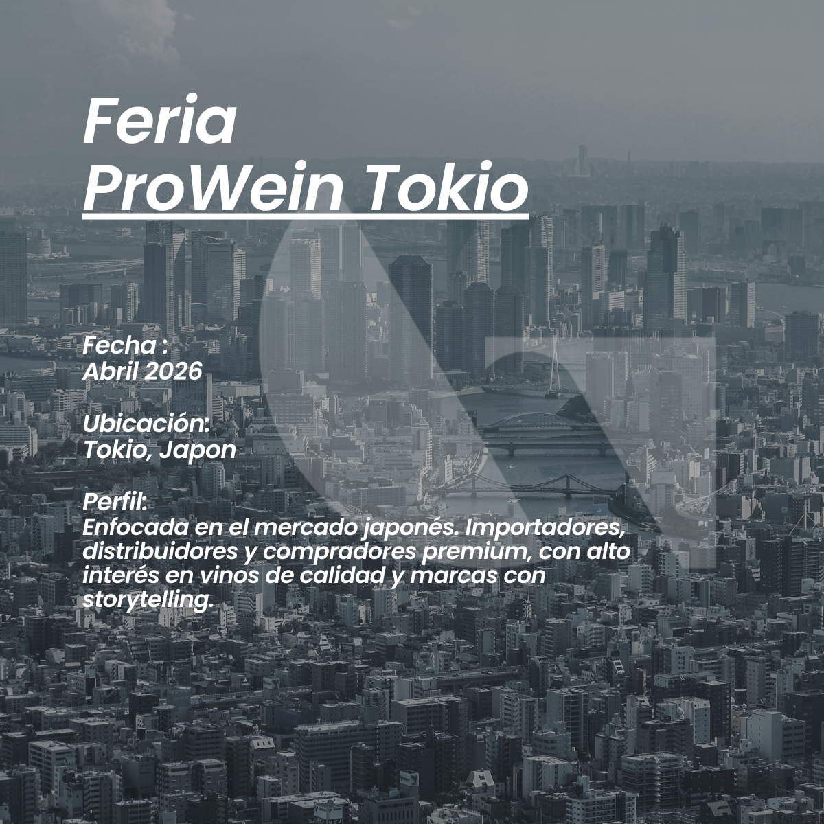 ProWein Tokio: Feria de vino enfocada en el mercado japonés, con presencia de importadores, distribuidores y compradores premium. Alto interés en vinos de calidad, marcas con identidad, storytelling y propuestas de valor diferenciadas.
